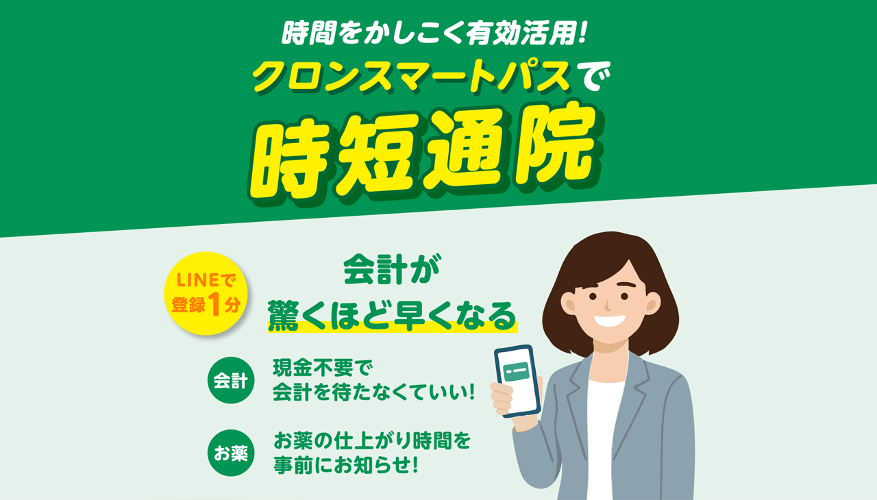 当クリニックでは、患者様の通院のご負担軽減や感染対策の観点から待ち時間削減のため「クロンスマートパス」を導入しております。