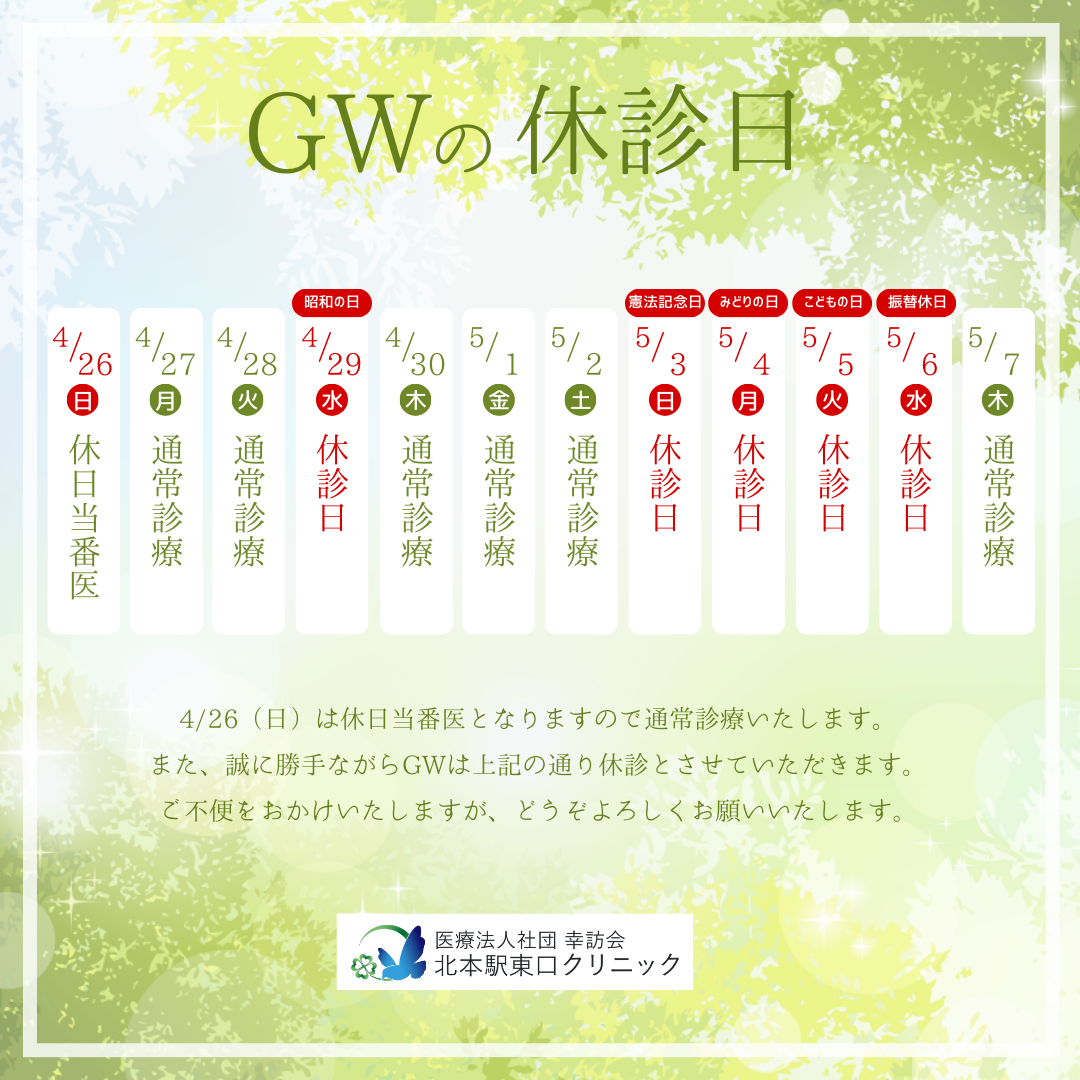 休診日 日曜、GW、夏季、年末年始